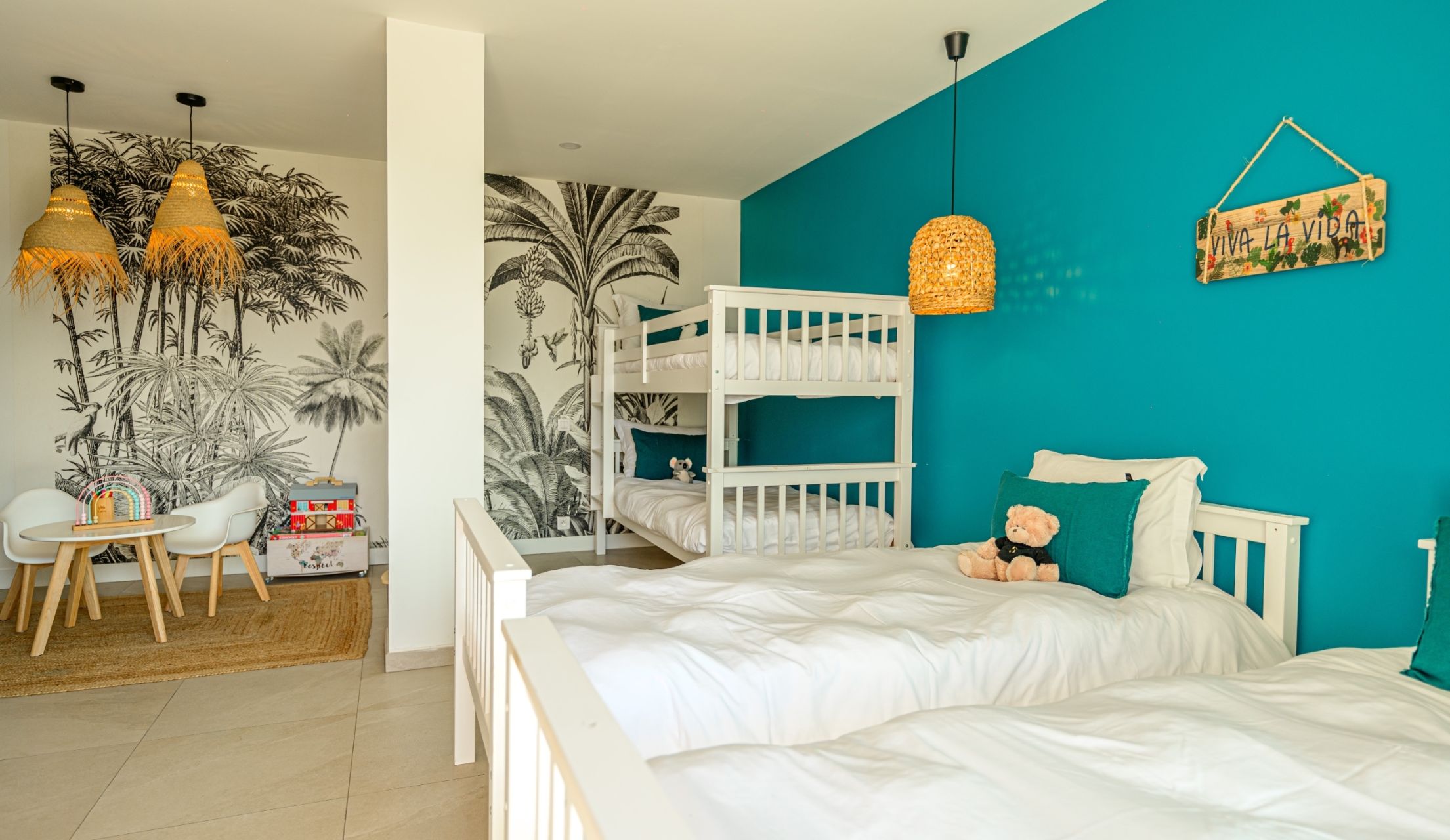 Facing the Mediterranean Sea, the conviviality of the place declines mainly three spacious suites and a dormitory for the youngest, each one having an access terrace and an impregnable sea view.