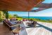 The main terrace has a magnificent outdoor kitchen with plancha. The 180° sea view is truly extraordinary and spectacular. Particular care has been taken with the landscaping. The plantations and rock fillings, together with an 18m swimming pool, contribute to this remarkable environment.