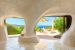 Outside, the architecture dissolves into the island’s topography: walls extend from boulders, terraces gently cascade down to a secluded cove of crystalline waters — a private lagoon of dreamlike clarity.