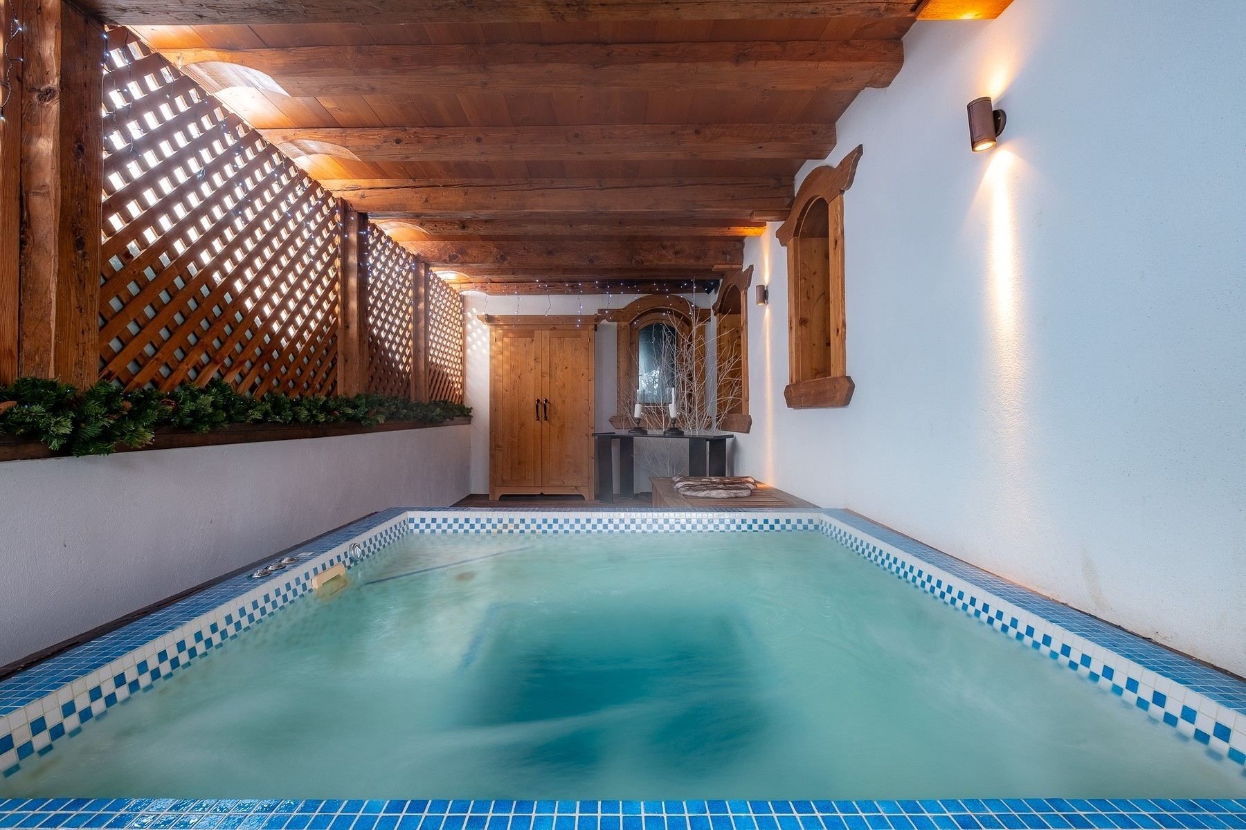 For the ultimate relaxation, the chalet boasts a wellness area with a hammam, jacuzzi, and massage room, while its expansive sunlit terraces provide breathtaking views of the snow-covered peaks.