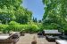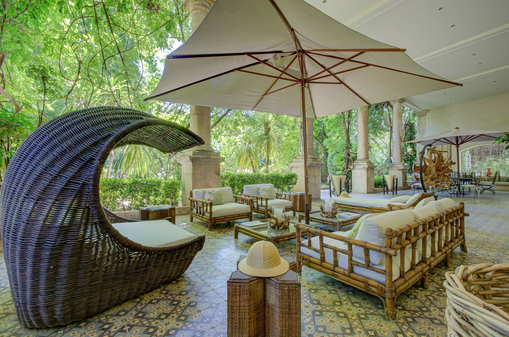 • Ground floor: spacious reception hall with wooden staircase, living room with 6-meter-high domed ceiling and fireplace, dining room, kitchen, 1925 boudoir, billiard room, laundry, and guest toilets. A spectacular covered colonial-style terrace (120 sq.m., 6 m ceiling height), supported by six Tuscan columns, opens onto the park.