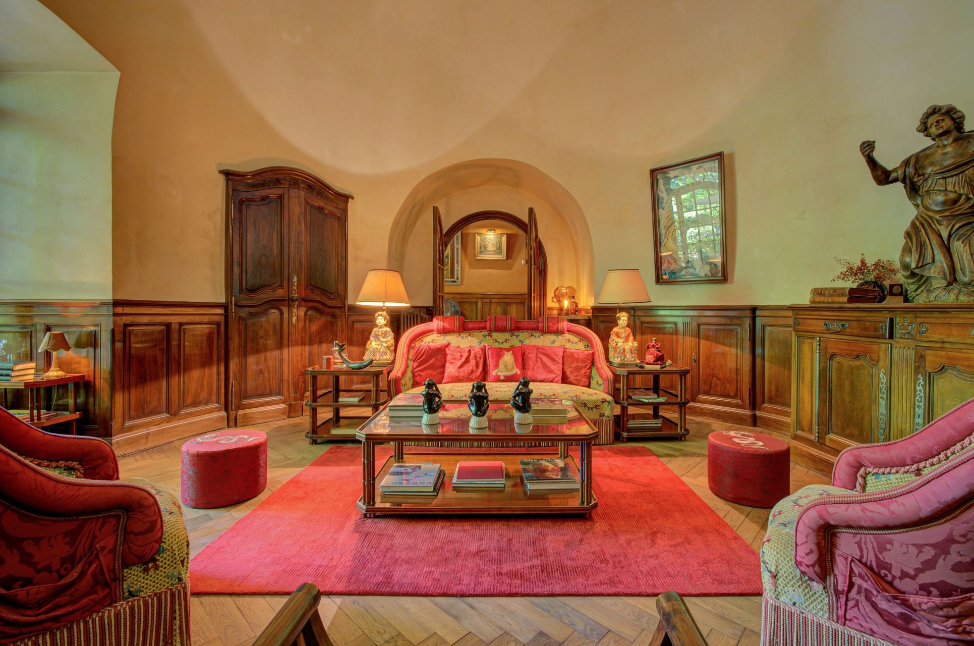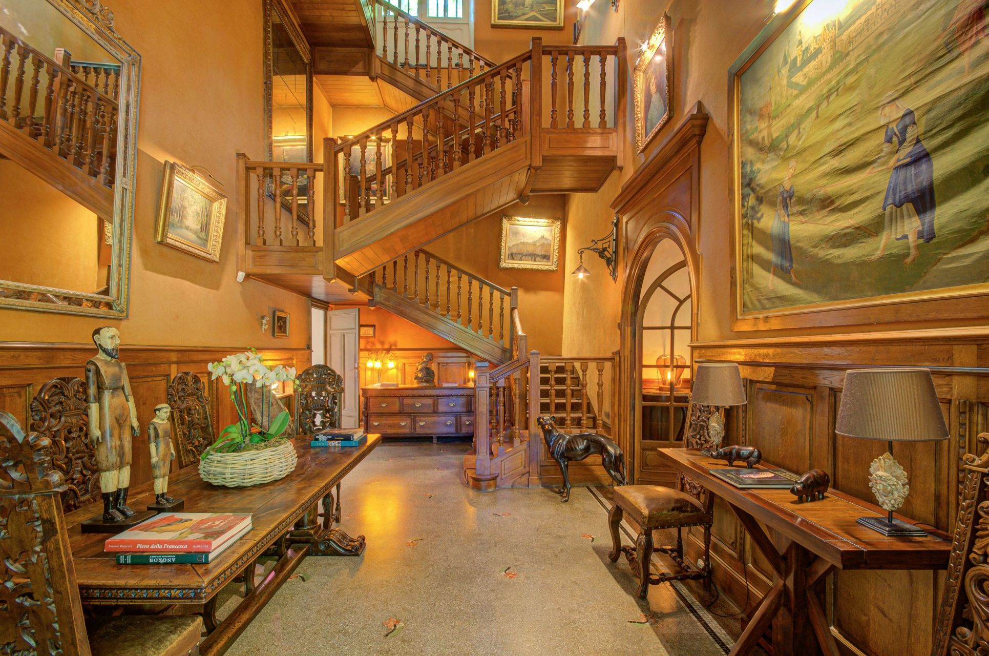 The main residence spans approximately 400 sq.m. of living space and is distinguished by a grand double-revolution stone staircase overlooking a nymphaeum adorned with pagan deities.