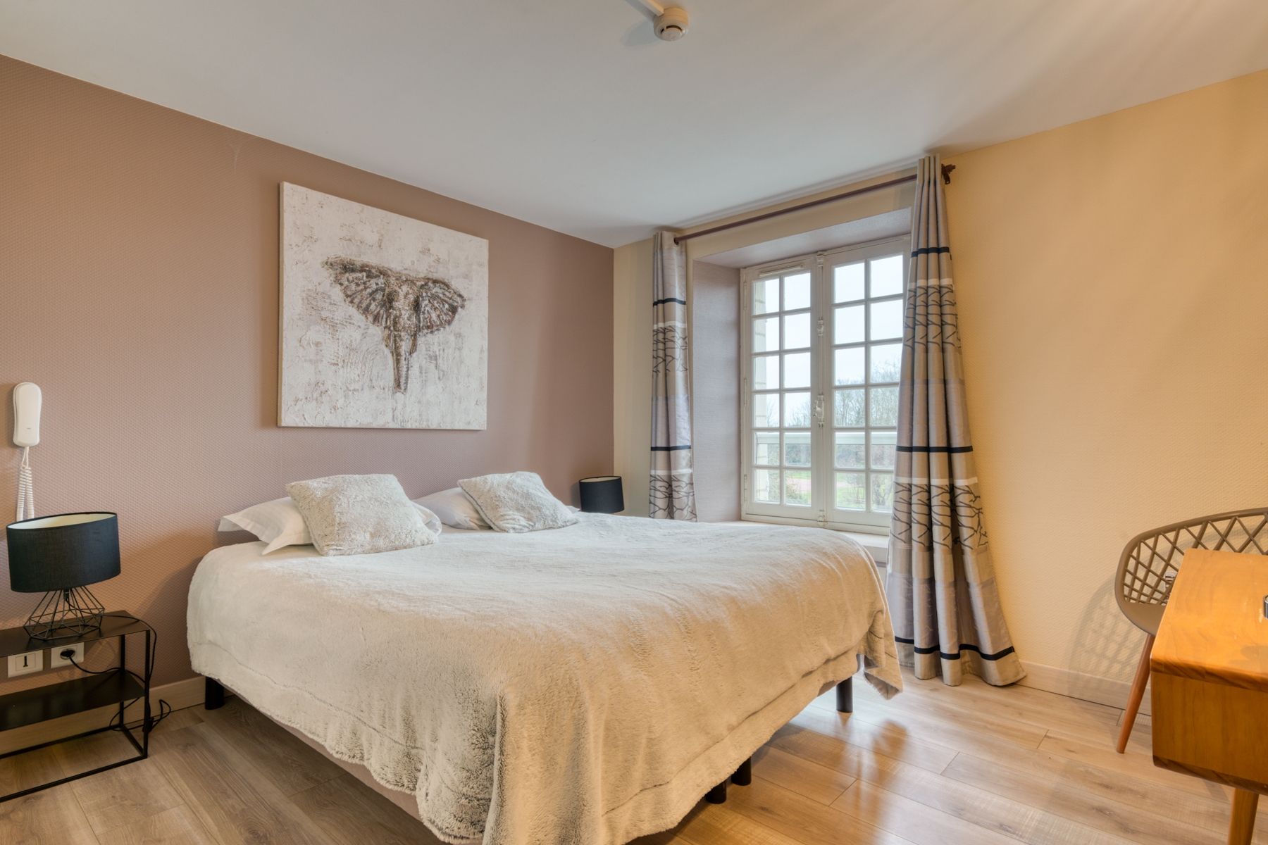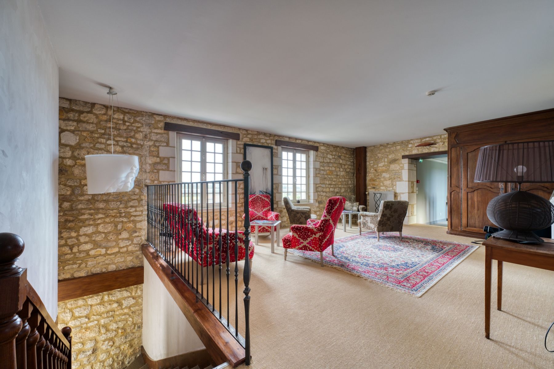 It has a 180 m2 terrace with a view of the park criss-crossed by the meanders of the La Course river crossing the mill.