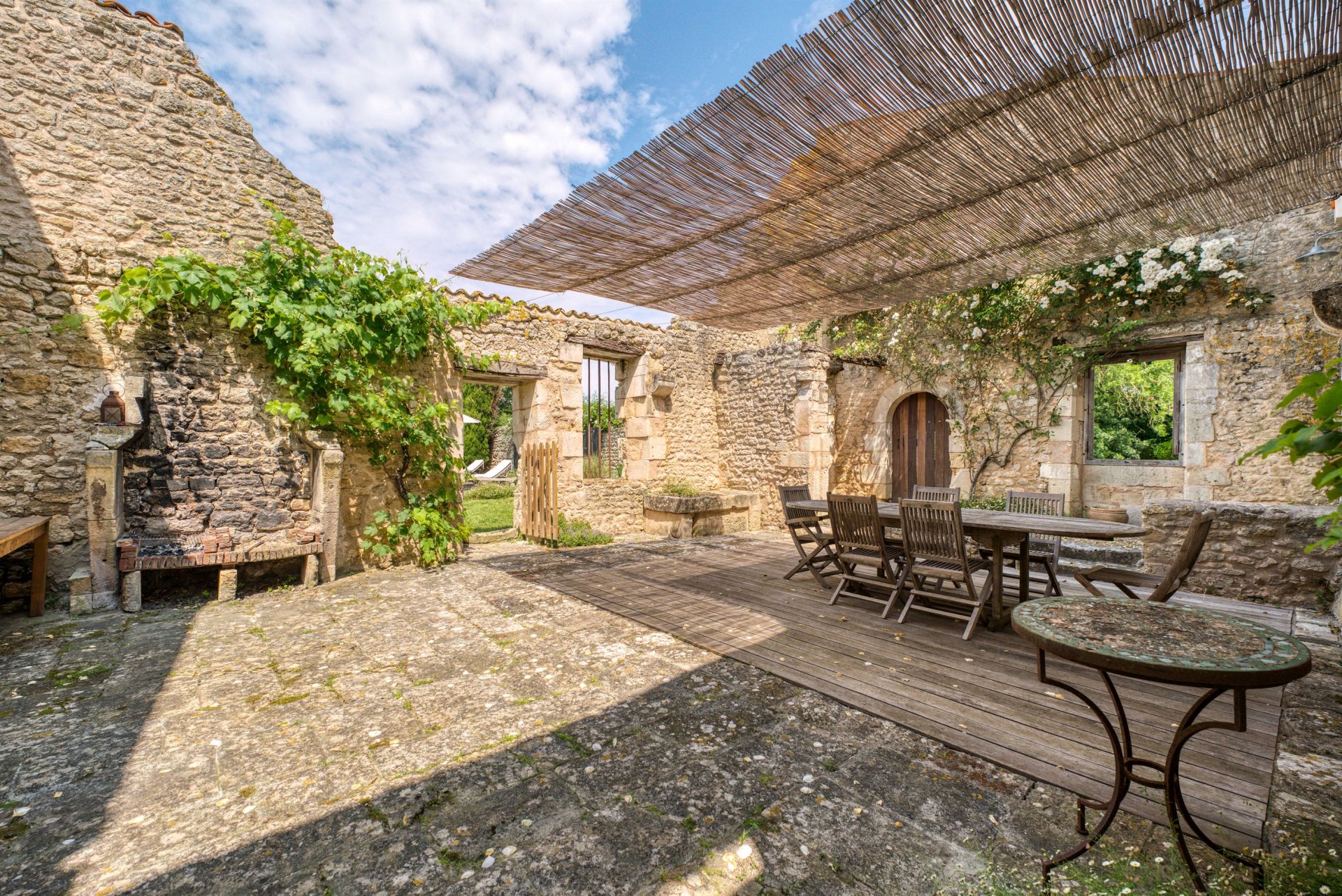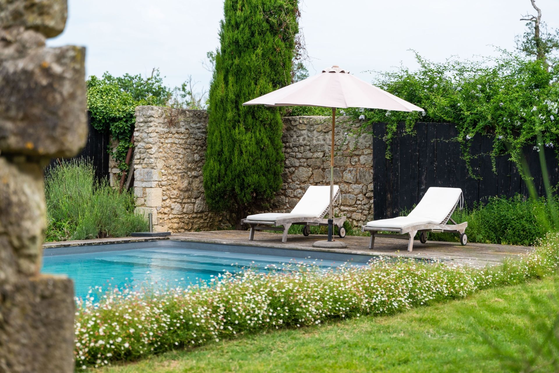 The heated swimming pool is located in an enchanting setting, surrounded by old stones and flowers, with a wooden terrace to relax on.