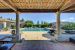 Large pool house with outdoor kitchen, closed garage and parking spaces with carport.