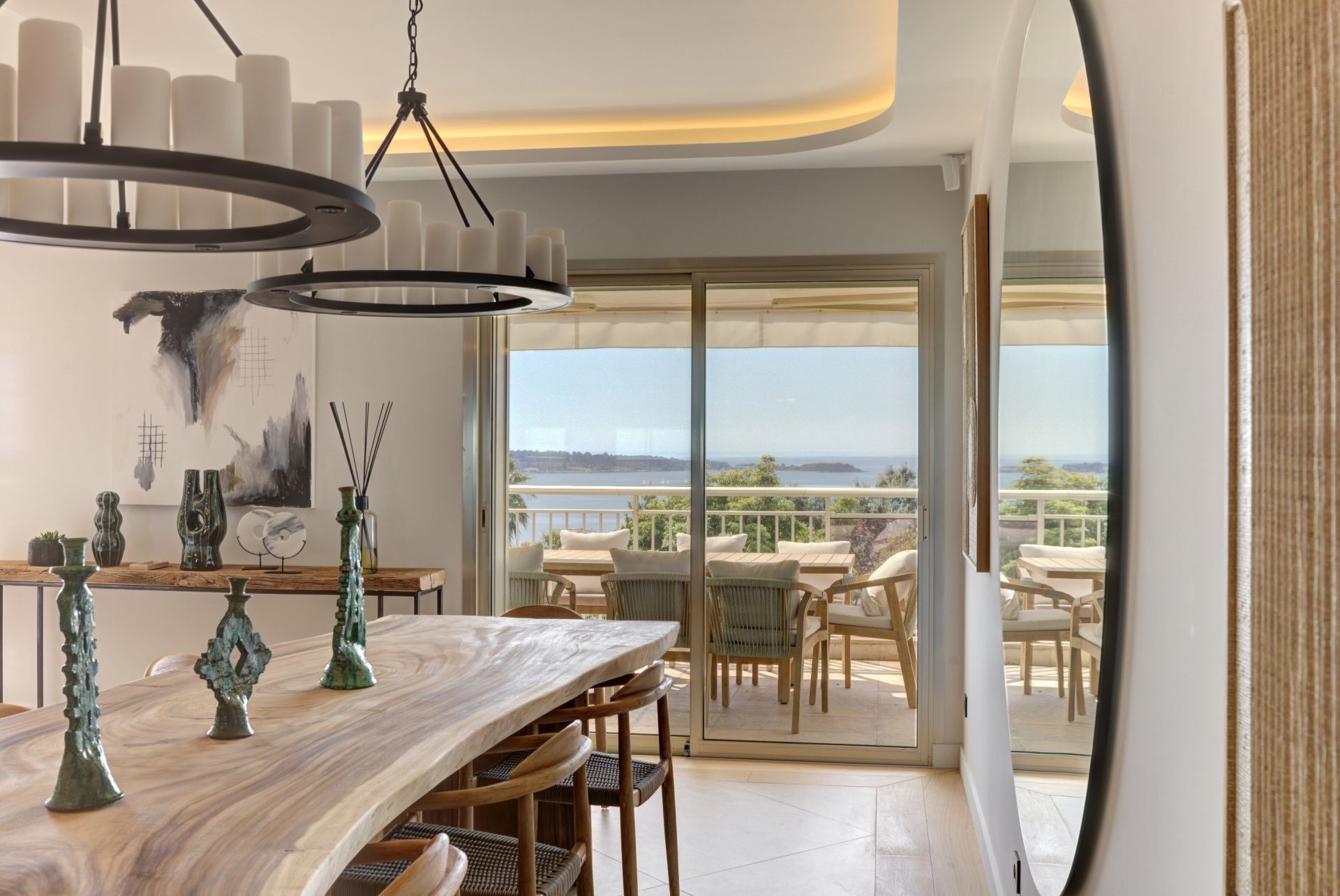 Dans une résidence de standing sécurisée avec gardien, piscine, tennis et parc de 2 hectares, superbe villa-appartement rénovée de 315 m² avec terrasses et jardin privé. Elle comprend de vastes espaces de vie, une cuisine ouverte équipée, 4 chambres en suite, salle de sport, salle de projection et buanderie. Vue mer panoramique sur les îles de Lérins et le Palm Beach. Exposition plein sud. 5 garages et cave. Calme, intimité et proximité de la Croisette.