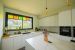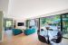 Dès l’entrée, les volumes s’ouvrent sur un vaste séjour baigné de soleil, prolongé par de larges baies vitrées qui effacent la frontière entre intérieur et extérieur. La cuisine ouverte, aux lignes contemporaines, invite à la convivialité.