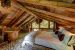 - Une chambre mansardée pleine de caractère, revêtue de bardage d’origine, avec une baignoire en cuivre antique indépendante, un lit double, des poutres apparentes et un tapis en peau de zèbre pour une touche de chic exotique.