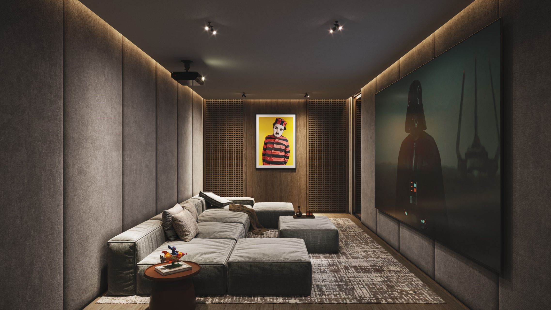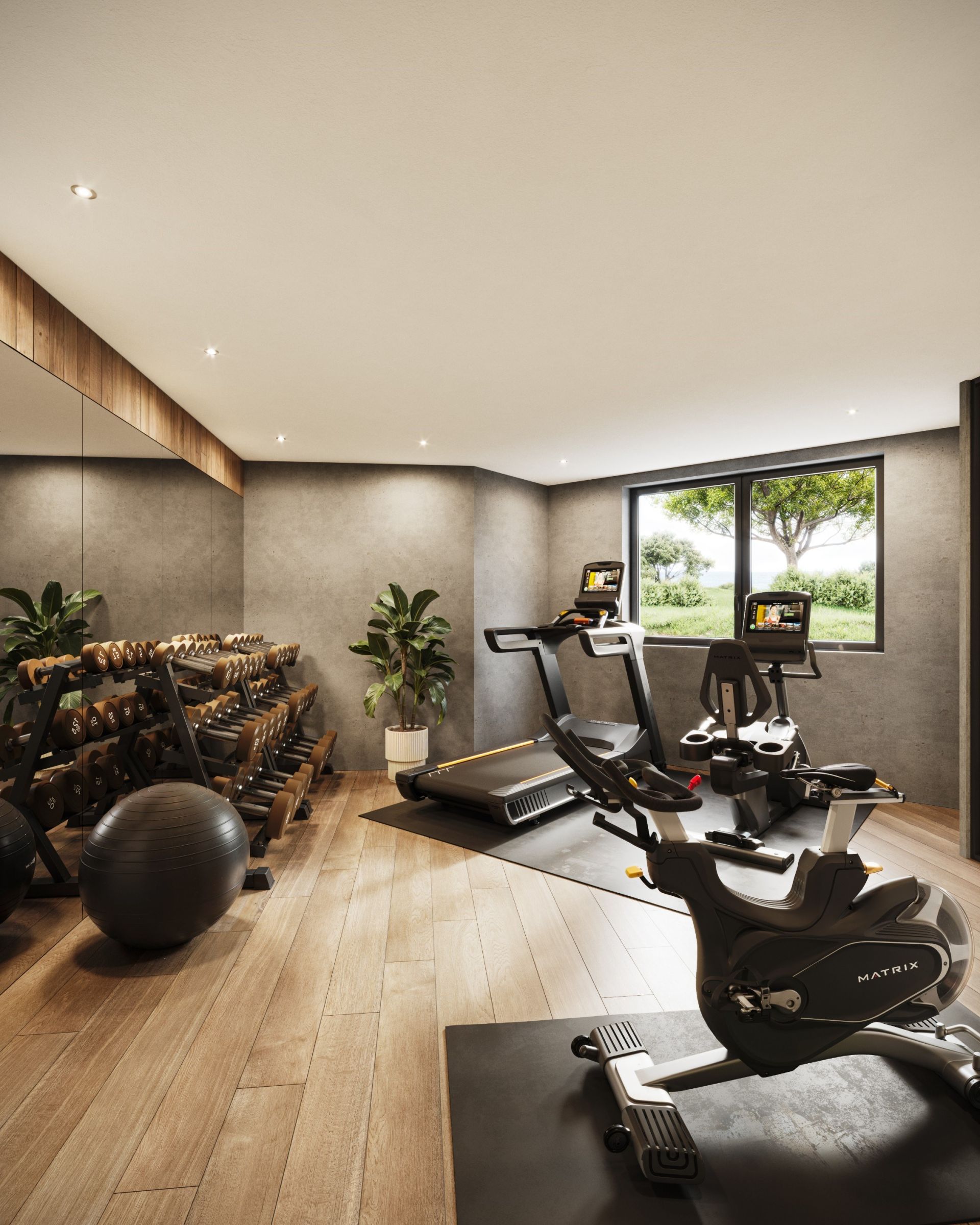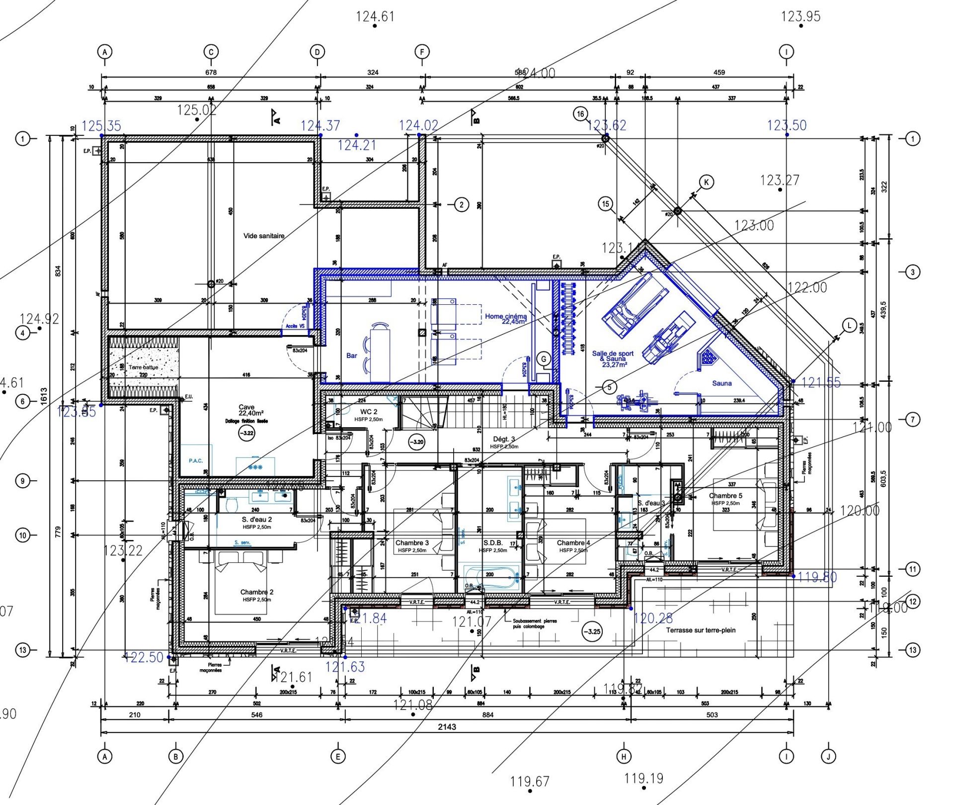 En rez-de-jardin : un dégagement avec toilettes séparées, une chambre avec salle d’eau attenante et toilettes, deux chambres, une salle de bains, une chambre avec salle d’eau et toilettes, une salle de sport avec sauna, une pièce home-cinéma et une très grande cave.