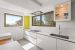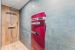 Au premier niveau, vous trouverez un vestiaire pour invités, une chambre idéale pour une fille au pair ou des amis, une salle d'eau, des toilettes séparées, un local technique et un bureau. Le deuxième niveau, revêtu de béton ciré, abrite une cuisine moderne entièrement équipée avec des rangements sur mesure, ainsi qu'un salon lumineux s'ouvrant sur une piscine intérieure, accompagnée de sa salle d'eau et de toilettes séparées.