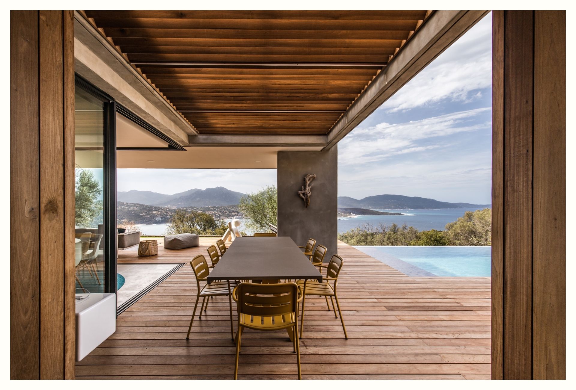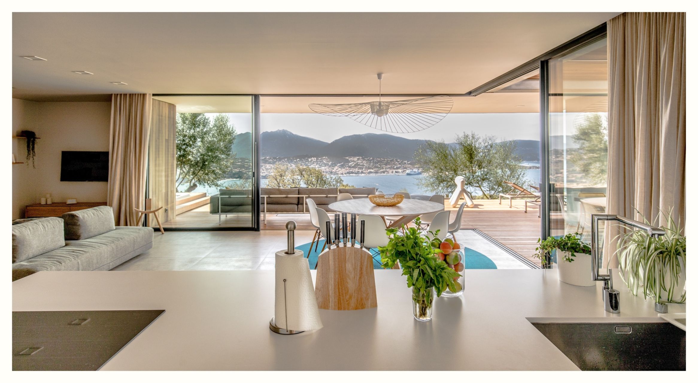 En surplomb du golfe du Valinco, non loin des plus belles plages d’Olmeto, cette villa d’architecte profite d’une situation idéale.