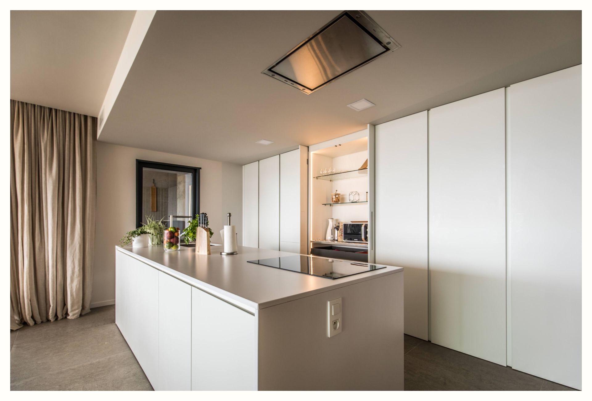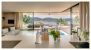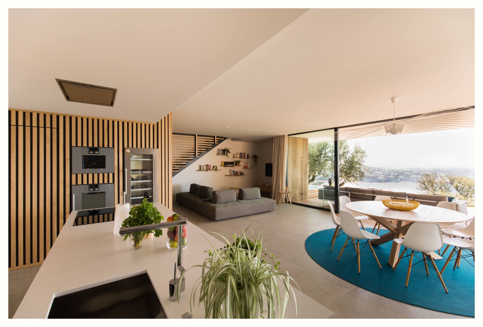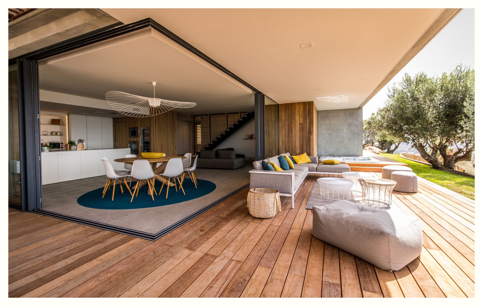 La pièce de vie s’ouvre entièrement sur le deck, le jacuzzi et la piscine à disparition, offrant une circulation fluide et une vision infinie.
