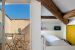 À l’étage, deux chambres d’enfants avec poutres apparentes, chacune ouvrant sur une terrasse tropézienne, offrent un espace de vie chaleureux. Une salle d’eau avec accès extérieur complète ce niveau.