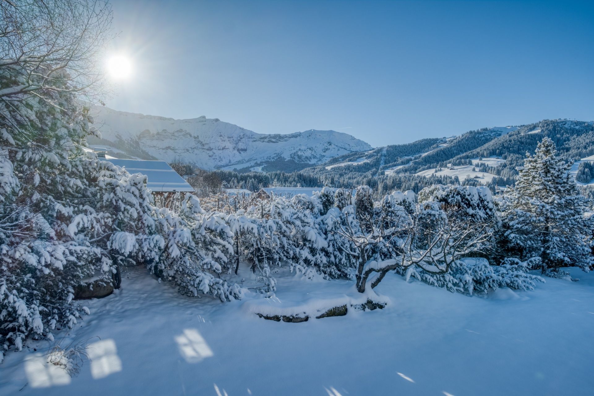 Cet appartement de luxe offre des espaces de vie ouverts sur une grande terrasse avec un accès direct au jardin proposant un panorama époustouflant sur les massifs du Mont d’Arbois et de Rochebrune.