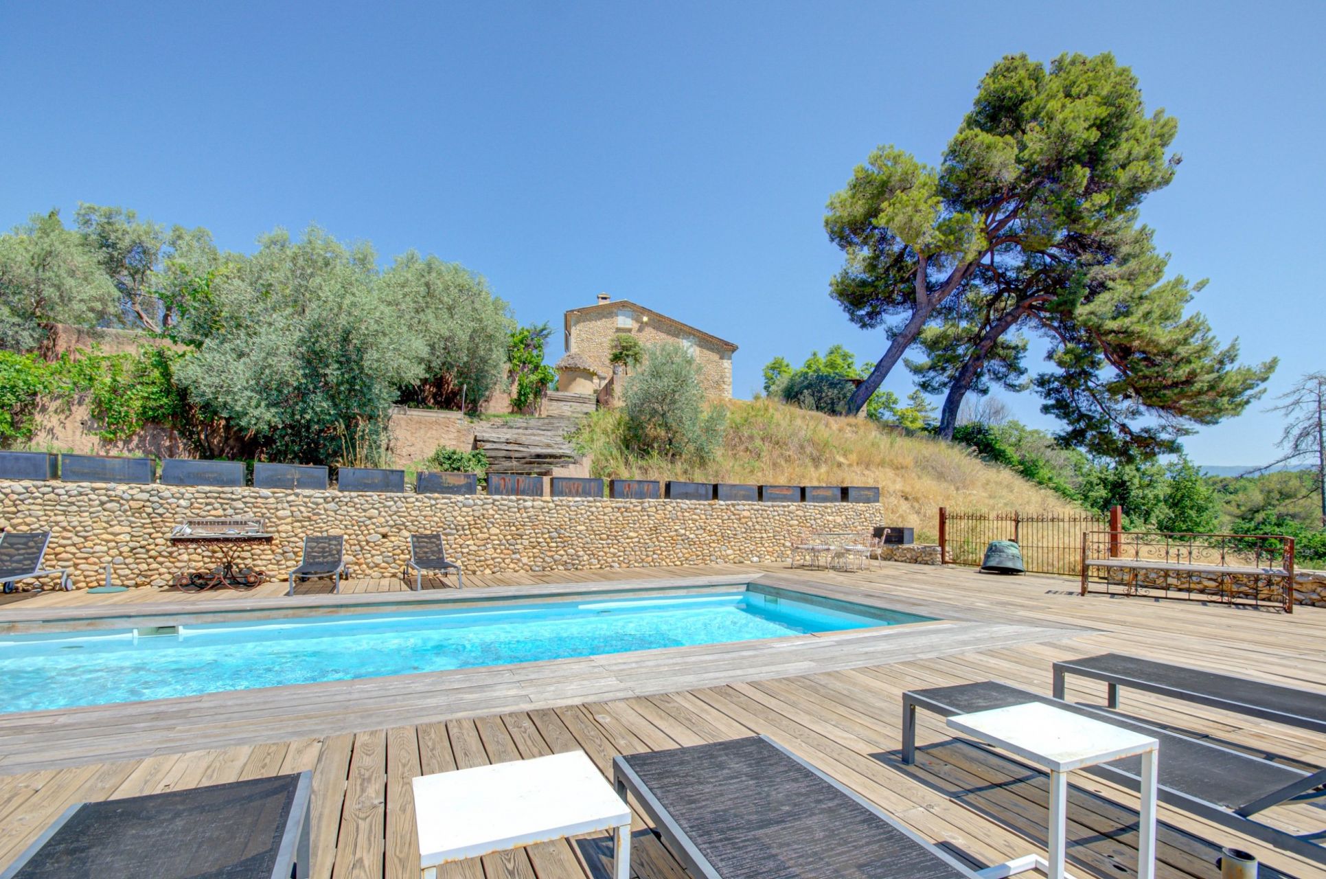 En contre bas à l’abri du vent exposé plein sud, piscine de 15X4 et son coin piscine entièrement fait en harmonie avec la demeure principale. Terrasse de 200 M2 Coin cuisine entièrement équipé, studio indépendant de 35 m2 avec salle d’eau. Garage de et annexes de 150 m2. Puits d’origine. Alimentation en eau par le canal de Provence ainsi que par deux forages.