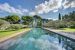 Extérieur : Parc d’1 hectare, Piscine de 24x5mètres, Terrasse avec chaises longues, Salon extérieur, Coin repas.