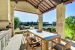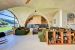 Pool house avec cheminée barbecue, salon extérieur et espace repas pour 8 personnes.