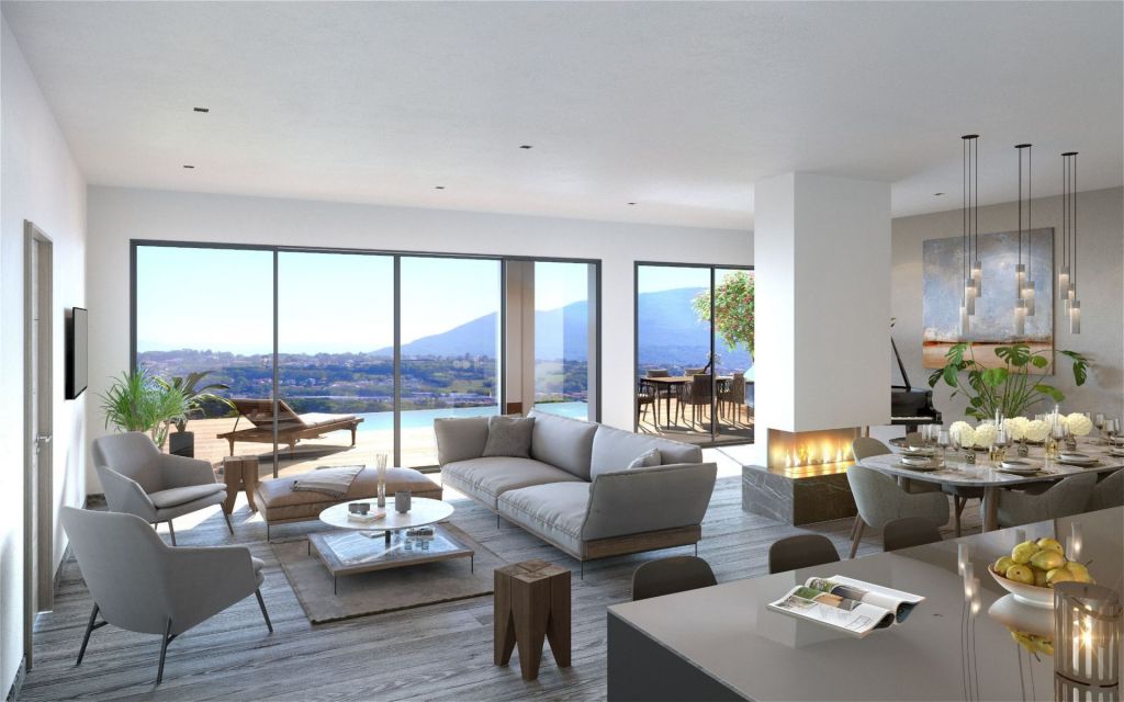 Vous serez également conquis par la vue panoramique mer et montagne qui traverse le salon, ajoutant une dimension spectaculaire à votre quotidien.